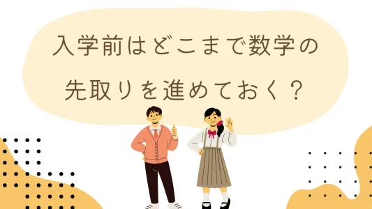 入学前の先取りの目安は中1数学の基礎(代数中心)となります。代数の基礎を固めておくと、入学後の授業にもついていきやすいでしょう。ただし先取りの目安は、学校の授業のレベルや進め方などにより変わってきます。