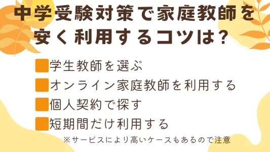 中学受験に向けて家庭教師を検討しているものの、「なるべく費用を抑えたい」と感じているご家庭は少なくないでしょう。しかし一方で、安い家庭教師だと指導の質に不安を感じるケースもあります。