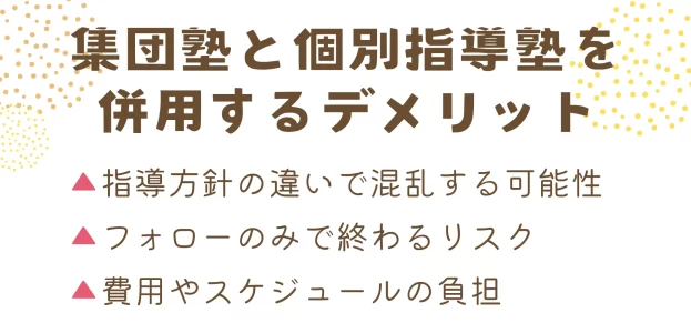集団塾と個別指導塾の併用により金銭面の負担が大きくなります。またお子さまもスケジュールがタイトになって疲労がたまったり、自習に充てられる時間が減るといったデメリットもあります。