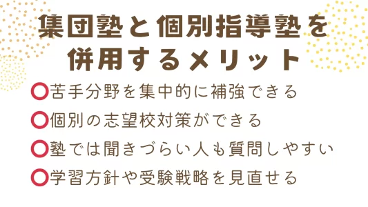 集団塾と個別指導塾の併用を検討するにあたり、確認しておきたいメリットとデメリットについてまとめました。