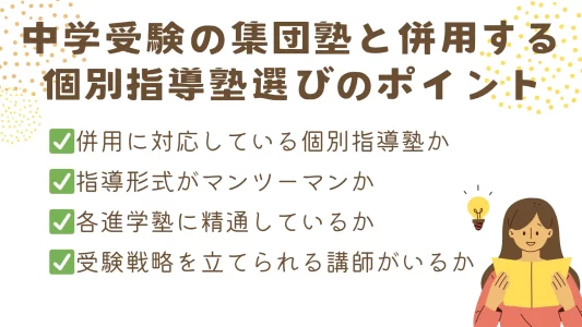 集団塾と個別指導塾を併用したい場合、中学受験に対応している個別指導塾ならどれでも良いというわけではありません。併用におすすめな個別指導塾選びのポイントをまとめました。