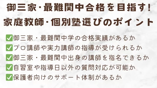 御三家・最難関中学を目指すならどのような家庭教師、個別指導塾を選んだら良いか、注目したい5つのポイントをまとめました。