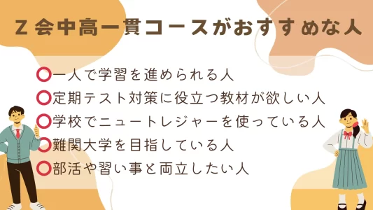 Z会中高一貫コースが向いている人として、一人で学習を進められること、定期テストに役立つ教材が欲しい人、ニュートレジャーを使っている人、難関大学を目指している人、部活や習い事と両立したい人があげられます。