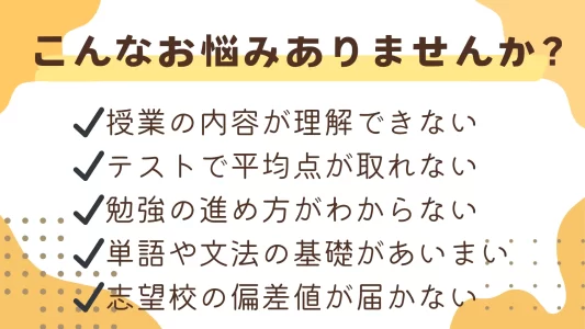 英語は単語・イディオムの暗記、文法の知識、長文読解など、複数の対策を並行して進める必要があり、学校の宿題や問題集をこなすだけでは学習が不十分な場合もあります。学校の授業進度や今の学習状況、目標などに応じて、自分に適した勉強の進め方を見つけられていないと、理解が不十分になり成績も上げにくくなります。