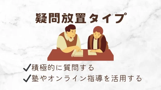 わからないところがあってもそのままにしてしまう、質問できない、解決できないままテストを迎えてしまう・・・という疑問放置タイプの人は、わからないところがあれば調べたり、先生に積極的に質問することをおすすめします。