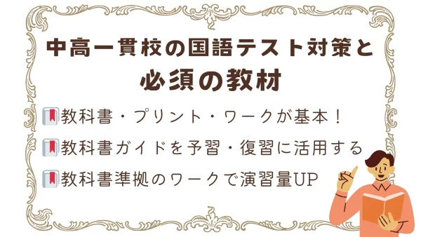 中高一貫校の国語のテスト対策では、まずは学校で配布されている教材を軸に、理解を深めるために教科書ガイドを、演習量を増やしたければ教科書準拠ワークも利用するのがおすすめです。