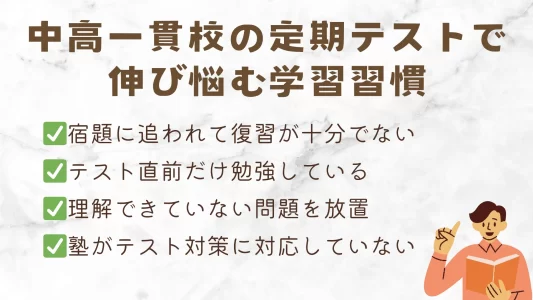 中高一貫校の定期テストは、範囲の広さやレベルの高さが原因で難しく感じやすく、日ごろの学習が宿題のみだったり、テスト直前の対策だけでは成績を上げにくいです。