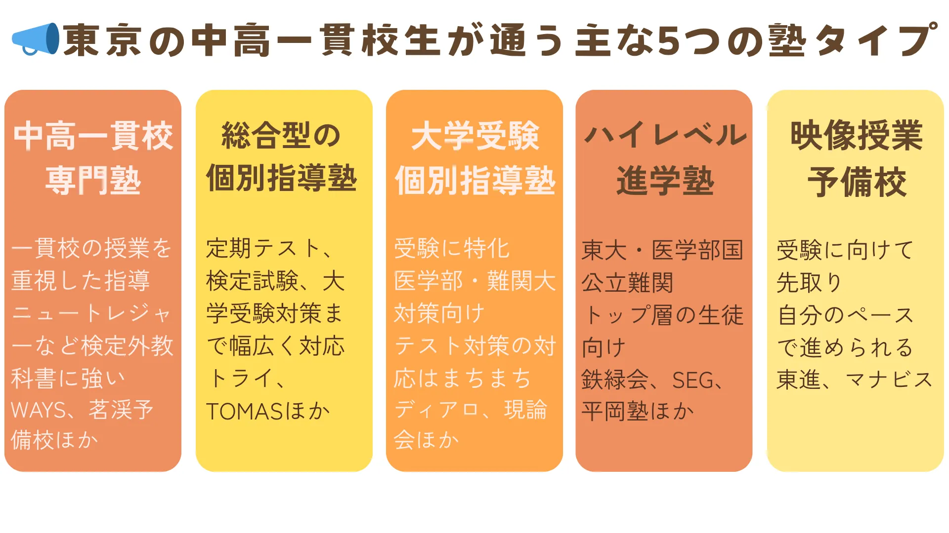塾を選ぶ際にまずは「塾のタイプ」を把握しておくと判断しやすくなります。中高一貫校生におすすめの塾は、大きく分けて以下の5タイプがあげられます。