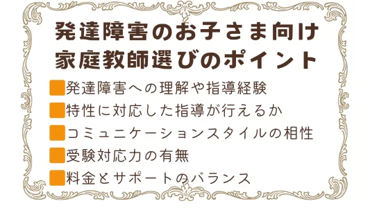 発達障害のお子さまに家庭教師を選ぶ際は、発達障害への理解がある教師や、特性により専門的な指導ができる教師を選ぶことが重要です。相性や指導方法、受験への対応力や料金なども注目すべきポイントとなります。