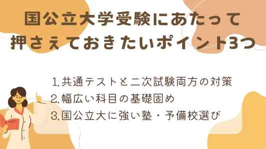 国公立大学受験では私立大学の対策と異なる対策が必要となります。押さえておきたいポイントをまとめました。