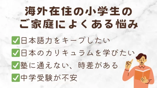 海外に在住する小学生のご家庭では、お子さまの日本語力維持や日本のカリキュラムへの対応、中学受験準備などさまざまなニーズがあります。