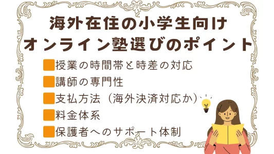 海外子女のオンライン塾選びでは時差の対応状況や講師の専門性、決済方法や受講環境など、注目すべきポイントがあります。