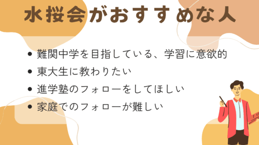 水桜会はマンツーマン指導なので積極的に先生とやり取りできる、意欲的な受験生が向いています。難関中学出身の東大生が教えるので、難関中学を目指している受験生にぴったりです。難関中学にそれほどこだわりがなく、学習に意欲的でない小学生とは相性が悪いかもしれません。