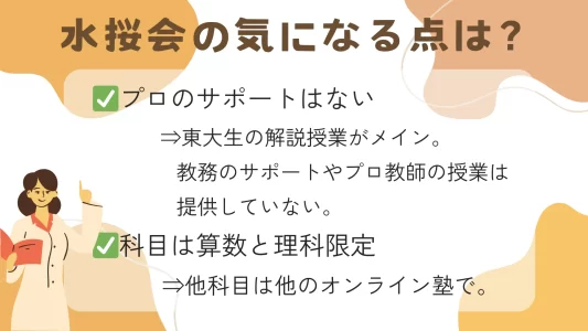 水桜会ではプロ講師の指導やプロの教育カウンセラーによる教育・進路相談のサポートを提供していることはうたわれていません。プロの指導やサポートを受けたいという人は他のオンライン塾(オンライン家庭教師)で探しましょう。