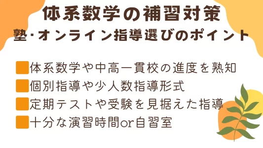 体系数学の補習で塾やオンライン指導を利用するなら、指導力が高いことはもちろんのこと、体系数学のカリキュラムを熟知しており、質問対応やテスト対策のフォローなどサポート面がしっかりしているところがおすすめです。