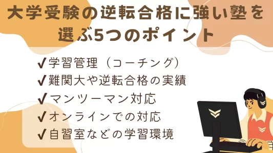 逆転合格に強い塾を選ぶポイントとして、学習管理があるか、難関大・逆転合格の実績、マンツーマン対応、オンライン対応、自習室などの学習環境などがあげられます。