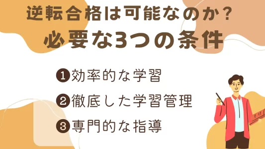 効率的な学習、徹底した学習管理、専門的な指導の3つの条件がそろうことで、逆転合格の可能性が高まると言えます。