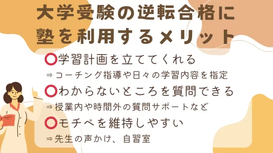 逆転合格に塾を利用するメリットとして、学習計画を立ててくれること、質問できること、モチベを維持しやすいことがあげられます。