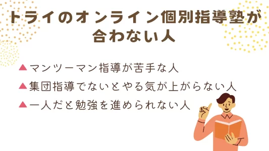 トライのオンライン個別指導塾が向いていない人として、マンツーマン指導が苦手な人、集団指導でないとやる気が上がらない人、一人だと勉強が進められない人があげられます。