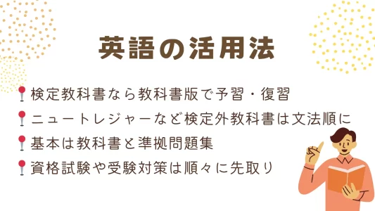 検定教科書でも検定外教科書でも、基本的には教科書と準拠問題集を軸に勉強することが大切です。教科書本文の単語確認や本文の訳は予習の段階でしておくように、復習段階では和訳も英訳もスムーズにできるように、準拠問題集があればそちらも解きます。さらに理解を深めたり演習量を増やす目的でスタディサプリを活用するのがおすすめです。