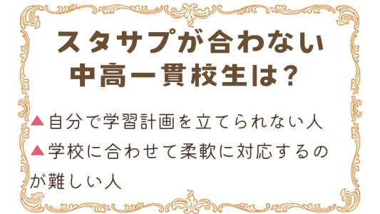 スタディサプリは中高一貫校生におすすめなオンライン学習ですが、自分で学習計画を立てて実行することができない、学校の進度やレベルに合わせて柔軟に対応するのが難しい、という中高一貫校生には合わないかもしれません。
