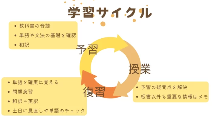 英語の苦手克服には、「予習・授業・復習」の学習サイクルを回すことが大切です。まずは教科書中心の学習で授業についていけるようにしましょう。