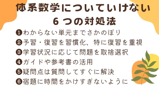 体系数学についていけないときの対処法として、つまずいたところまでさかのぼって復習すること、予習・復習の習慣化、問題の取捨選択、ガイドや参考書の活用、疑問点を早めに解消すること、宿題に時間をかけすぎないことがあげられます。