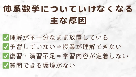 体系数学は進みが速く内容が濃いため、予習・復習を一人で進めるのも難しい面があることはすでに確認したとおりです。ここではそんな体系数学についていけなくなる主な原因を整理しました。