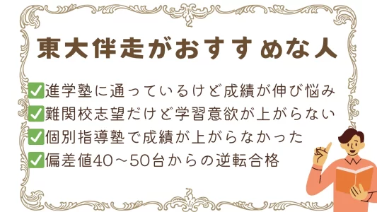 進学塾に通っているけれど授業で理解できないところがそのままになっている、宿題に追われてしまい、学習したことが定着していない、勉強している割にテストで点数が取れない・・・など、成績が伸び悩んでいる人に東大伴走はおすすめです。面談での受験戦略と「できる」まで指導する授業で、得点力を高められるようリードします。