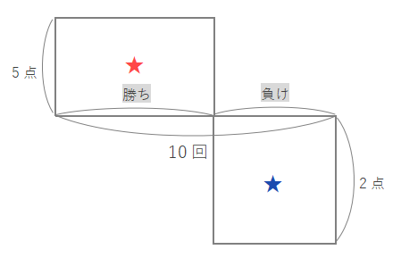なお例題2の場合は持ち点の20点があるので、そのままだと面積が合わなくなります(10回勝つと70点なのに面積は50)。ゲームを10回続けて42点になった→22点増えたと考え、★と★の面積の差は22として考えます。