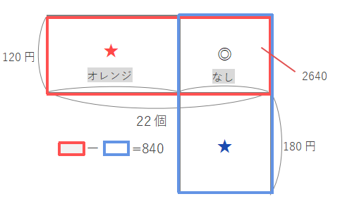 オレンジの代金がなしの代金より840円高くなるので、=840となります。しかしこのままでは考えづらいので、下の図のように赤い長方形と青い長方形を作って考えます。このとき◎の部分が共通なので、赤い長方形青い長方形=(+◎)ー(+◎)==840になります。