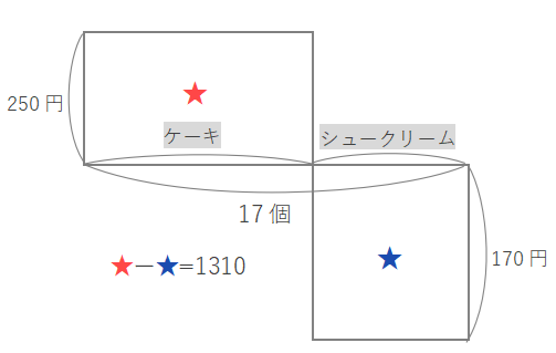 【例題2】1個170円のシュークリームと1個250円のケーキを合わせて17個買ったところ、ケーキの代金がシュークリームの代金より1310円高くなりました。シュークリームをいくつ買いましたか。