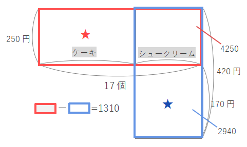 ケーキの代金がシュークリームの代金より1310円高くなるので、=1310となります。下の図で赤い長方形青い長方形も1310になります。