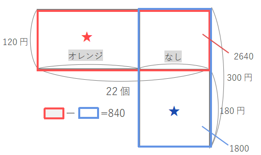 すべて120円のオレンジだったとすると、\(120\times22=2640\)円になり、オレンジの代金-なしの代金も2640円になります。しかし実際には840円オレンジの代金の方が高かったので、\(2640-840=1800\)円の差があります。