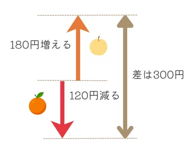 また、120円のオレンジ1個を180円のなし1個に置き換えるごとに、差が\(120+180=300\)円縮まります。