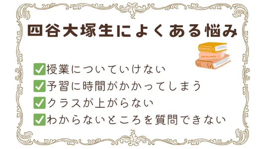 四谷大塚生によくある悩みとして、授業についていけない、予習に時間をとられる、組み分けで点がとれない、わからないところを直接質問できない(進学くらぶ生など)、があげられます。
